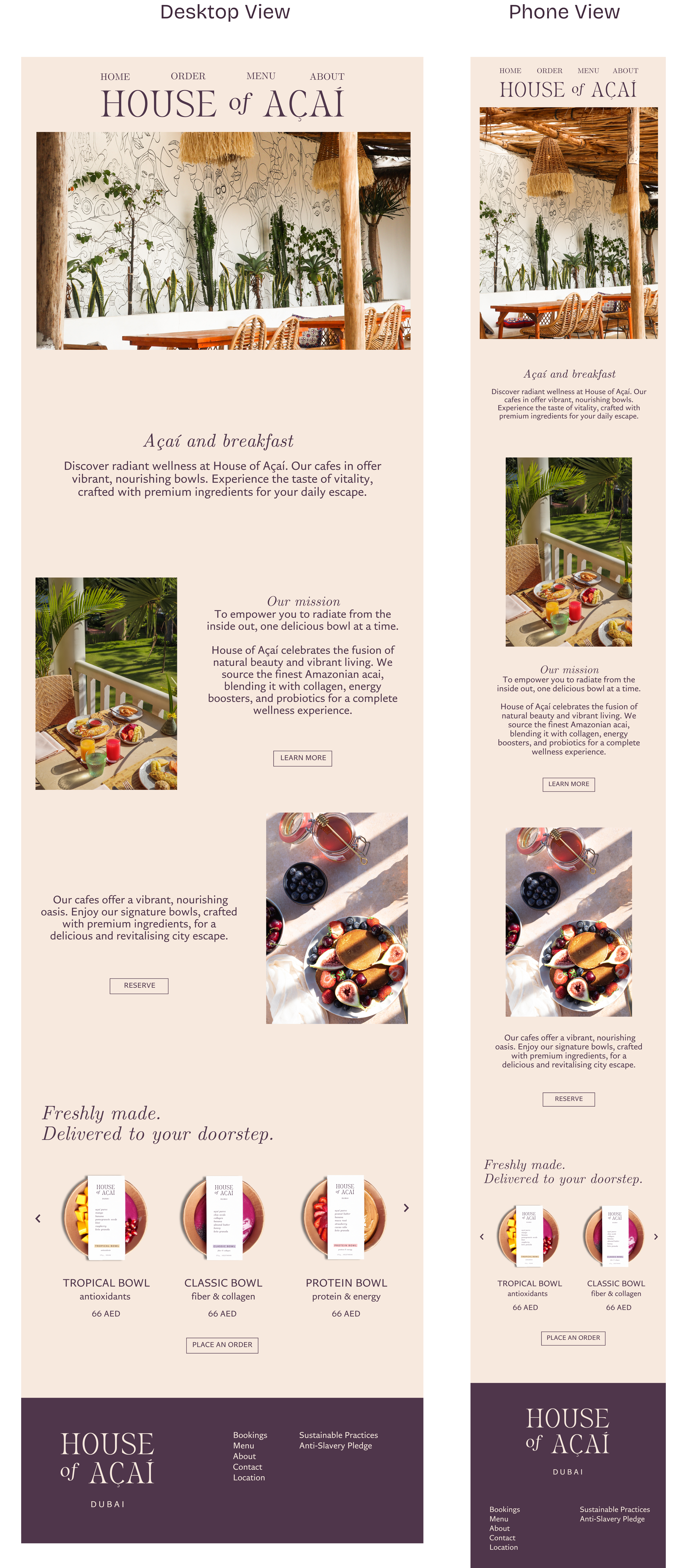 For House of Açaí, a premium Dubai-based açaí bowl brand with a focus on luxury wellness and natural nutrition, the design narrative was built around three key principles: elegance, freshness, and clarity. Recognising the brand's dedication to health-conscious consumers, including those with dietary requirements, I developed a sophisticated aesthetic that conveyed purity and premium quality, whilst highlighting the functional benefits of their ethically sourced ingredients.